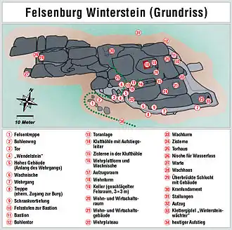 The Winterstein, also called the Hinteres Raubschloss, is an isolated, elongated rock massif in the hinterland of Saxon Switzerland in East Germany. On the summit there was once a medieval castle, also called Winterstein, of which remains such as rebates for timber beams, hewn-out steps and cisterns are still visible.