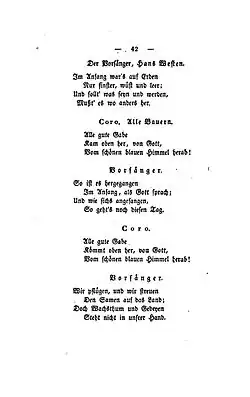 "Wir pflügen und wir streuen" (We plough and sow) is a sacred song about thanksgiving for harvest, with text by Matthias Claudius. It was first published in 1783 as Das Bauernlied (The peasants' song). It became a hymn, with melodies by Johann André and Johann Abraham Peter Schulz. It appears in the current German Protestant hymnal Evangelisches Gesangbuch as EG 508 with the latter melody, and is used mostly for the German Erntedankfest. The song is also known by its refrain, "Alle gute Gabe" (All good gift). Jane Montgomery Campbell translated it to English in 1861 as "We plough the fields and scatter".