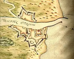 Following the Teutonic annexation Gdańsk, in the fourteenth century, a wooden fortress stood by the mouth of the river Vistula, flowing into the Baltic Sea; which was burnt down by a Hussite Sirotci raid, in September 1433. In 1482, a brick lighthouse tower was built in place of the former fortress. The tower was assigned to control the passage of ships, traveling to and from the Bay of Gdańsk's main port city of Gdańsk. The Wisłoujście Fortress was target for military campaigns. In 1577 the fortress was besieged several times by Stefan Batory, inconclusively, during the Battle of Oliwa (1627), when the fortress was cannonaded by a Swedish fleet; in 1734 by Russian-Saxon, in 1793 by Prussian, in 1807 by Napoleonic, and once again in 1814 by Prussian fleets. Between 1622-1629 the fortress was known as Latarnia (Lighthouse, Polish), under the name of a fortress - while actually being a naval base of the Polish–Lithuanian Commonwealth.[5] On the night of 5–6 July 1628 the fortress was attacked with artillery fire, from a Swedish fleet traveling from Wisłoujście, into the fortress, sinking the vessel Złoty Lew (Golden Lion, Polish), and a galleon.[6]