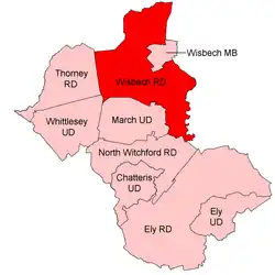 When first created, the district consisted of two detached parts separated by the long, narrow tail of Wisbech Municipal Borough. In 1933 the south-western part of Wisbech MB was transferred to the parish of Elm, leaving Wisbech RD surrounding the town on three sides.[2][3]