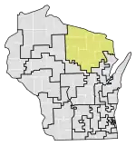 The 12th Senate district of Wisconsin is one of 33 districts in the Wisconsin Senate.[1] Located in northern Wisconsin, the district comprises Florence, Forest, Langlade, Lincoln, Marinette, Oneida, and Vilas counties, and parts of northern Oconto County, northwest Shawano County, and northeast Marathon County. It contains the cities of Antigo, Eagle River, Marinette, Merrill, Peshtigo, Rhinelander, and Tomahawk.[2]