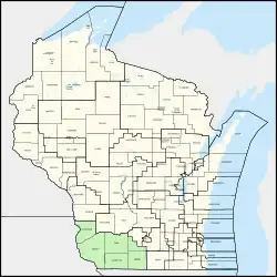 Wisconsin's 17th Senate district is one of 33 districts in the Wisconsin Senate.[1] Located in southwest Wisconsin, the district comprises all of Crawford, Grant, Green, Lafayette, and Iowa counties, as well as parts of southwest Dane County. It includes the cities of Boscobel, Brodhead, Cuba City, Darlington, Dodgeville, Lancaster, Mineral Point, Monroe, Oregon, Platteville, Prairie du Chien, and Shullsburg.[2]
