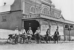 Lionel married Danish immigrant Maria Elise Wiuff at Ipswich in late 1890, and in the same year joined Campbell in partnership as Wiss Bros, storekeepers, at Engelsburg. They established one of the most important businesses in the town, which was emerging as a district centre following the closer settlement of the Fassifern Scrub for dairying and agriculture. They provided a general store which not only sold a great variety of goods, but also traded farm produce, acted as agent for major farm equipment suppliers, and offered substantial credit, doing much to assist local farmers. As early as 1892, Wiss Bros were the local agents for the United, Fire and Marine Insurance Co., and from 1894 to 1897 held the Engelsburg postal receiving office, until construction of an official post office in 1897. Until the railway came to Kalbar in 1916, Wiss Bros transported local produce to the nearest railhead at Munbilla on behalf of the local farmers. The firm was a principal employer in the town, with 8 to 10 employees by the 1920s.[1]