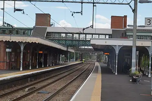 Witham railway station is on the Great Eastern Main Line (GEML) in the East of England, serving the town of Witham, Essex. It is situated about half a mile (1 km) from the north of the town centre and is 38 miles 48 chains (62.1 km) down the line from London Liverpool Street. On the GEML, Witham is situated between Hatfield Peverel to the west and Kelvedon to the east.[1] It is the junction for the Braintree Branch Line to the north-west, which opened in 1848; between 1848 and 1964, it was also the junction for a south-east-facing branch line to Maldon. Its three-letter station code is WTM.