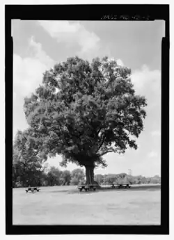 Located in Maryland, the oak sits on the former site of the Mount Welby House.[11][12][13] The house that was home to British sympathizers Dr. Samuel Debutts and his family.[11] Today the tree is near the parking lot for the Oxon Cove Park and Oxon Hill Farm in Oxon Hill.[14][12] The oak witnessed the Battle of Bladensburg on 24 August 1814.[15][13] The oak is believed to be at least 200 years old, which is past the average life expectancy of a Willow Oak.