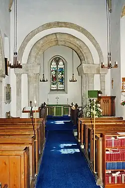 As originally built the church would have had no aisles. In the middle of the 12th century a Norman north aisle was added, linked with the nave by a two-bay north arcade.[6] The present south doorway of the nave, and the east and south windows of the chancel are late 13th century Decorated Gothic insertions.[6] The ashlar west tower is late 13th or early 14th century.[6] In the 14th century the north aisle was rebuilt and the north chapel was added.[6] The north chapel has an early 14th-century tomb recess.[6] The tall Perpendicular Gothic windows in the south wall of the nave were inserted later in the Middle Ages.[6]