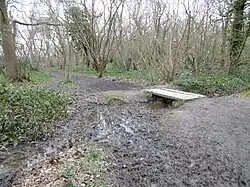 The watercourse is usually called the Wogebourne,[1][2] or sometimes River Wogebourne.[2][3][4] This name has been in use since at least the fourteenth century,[2] when the alternative spelling Woghbourne, was also in use in addition to the present day spelling.[2] Another name that has been used to refer to the watercourse since at least the sixteenth century[2] is Plumstead River.[2][4][5] More recently the river has been called Wickham Valley Watercourse,[1][2][4][6] or Wickham Valley Waterway.[3]