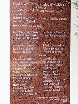 - ^ These included dermatologist Dr. Piotr Zalewski and nurses Maria Łaniewska and Wanda Tomaszewska (survivors of the massacre at the St. Lazarus Hospital), as well as a group of physicians from hospitals on Krakowskie Przedmieście, including internist Dr. Edward Górka, ophthalmologist Dr. Jerzy Morawiecki and gynecologist Dr. Roman Borkowski (Gursztyn (2014, p. 312)).