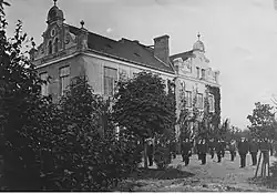 At the outbreak of the uprising, the facility with 480 beds had 220 patients. Among the staff present were eleven doctors and a group of medical students.[7] The Home Army command planned that Wola Hospital would become the central medical point in Wola after the uprising began.[8] Moreover, before "W" Hour, a medical patrol was formed in the hospital, tasked with providing medical assistance to Home Army soldiers fighting in Ulrychów. The patrol, led by Dr. Kazimierz Drozdowski, included several medical students and some physical workers of the hospital. However, as the Germans quickly dispersed the Wola Subdistrict units advancing on Ulrychów, the patrol members were ultimately forced to stay at Płocka Street.[9] Meanwhile, as a result of the first battles fought on 1 August 1944, Wola Hospital found itself on the border between areas controlled by the insurgents and those under German control.[10] Over the next three days, staff members who had been unable to reach their workplace due to the outbreak of fighting gradually arrived at the hospital. There was also a constant influx of wounded and refugees from quarters of Wola occupied by the Germans.[11][12][13] The hospital was repeatedly visited by the chief of sanitary services of the Home Army's Wola Subdistrict.[14]