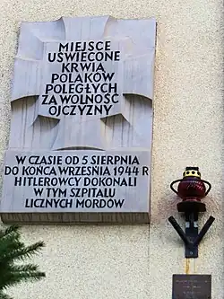 - 26 Płocka Street – a small monument and two commemorative stones, unveiled in 1989 in front of the building of the Institute of Tuberculosis and Lung Diseases, commemorate the patients and staff of the Wola Hospital murdered on 5 August 1944. The victims of the massacre are also commemorated by a plaque inside the building;[248][249]