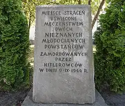 - ^ Dr. Wesołowski (1974, p. 61) claimed that the two insurgents were hanged around August 6. Other sources point to August 9. A memorial plaque in the hospital courtyard, on the other hand, shows the incorrect date of September 9. Sławińska (2015, pp. 118–119) claimed that the hanged insurgents were closely related (they were supposed to be father and son or two brothers) (Utracka (2009, p. 74)).