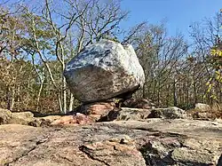 Wolf Rock, also known as Wolfpit Rocks, Woolfes Rocks, and Wolfe's Rock is the name of a notable gneiss and quartz conglomerate glacial erratic in Mansfield, Connecticut, perched atop a 40-foot cliff. The rock itself is six feet tall and almost round.[1] The surrounding landscape also contains many boulders and crags. The rock was once part of a tower used to view the landscape.