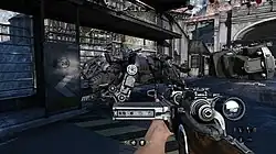In combat, a cover system can be used as assistance against enemies. Players have the ability to lean around, over, and under cover, which can be used as a tactical advantage during shootouts and stealth levels.[5] Players have access to a weapon inventory, which allows the player to carry as many weapons as they find. With some of these weapons, players have the ability to dual wield, giving them an advantage over enemies by dealing twice as much damage.[4] The Old Blood adds various weapons that were not featured in The New Order,[6] such as a steel pipe.[7] The steel pipe is one of the biggest additions to the game; it consists of two small steel pipes which can be connected together to make a larger pipe. Both pipe states can be used as a melee attacks (each with their own animations) and in specific circumstances. The two small pipes, called "Pipes" in the weapon inventory, can be used to climb rock walls, and the large pipe, called "Pipe" in the inventory, is used to break open weak environmental surfaces.[7] The game gives players a wide variety of weapon options—they can be found on the ground, retrieved from dead enemies, or removed from their stationary position and carried around.[8] Weapon ammunition must be manually retrieved from the ground or from dead enemies.[9]