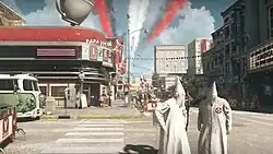 The story was described to be both "character driven" and "location driven", as the entire development team can propose ideas on possible level locations while the story team created the narrative that occurs in the chosen space.[29] America was chosen as its setting because it was Blazkowicz's homeland, making the story more personal.[37] America did not appear as a level in The New Order, as the team felt a full sequel was needed to explore the setting in a meaningful way.[25] Ultimately, the team chose locations that were "iconic" but not commonly explored in other mediums.[38] Americana imagery and retrofuturism inspired the game's overall aesthetics.[39] The team wanted to explore an America where Nazi Germany had subverted its culture and infiltrated its values into everyday American life.[40] The team intended to show a possible spectrum of American responses towards Nazi rule.[41] The Roswell level showed an American population that has adapted to Nazi rule, being "a reflection of ordinary society under Nazi oppression". In contrast, New Orleans was transformed into a ghetto used for imprisoning rebel fighters and dissidents.[42] For the Texas level, the team recruited Kevin Cloud from id Software to help modify the level's script.[37] MachineGames had a hard time casting Rip Blazkowicz, who was racist and abusive. Cinematic performance director Tom Keegan approached Glenn Morshower, whom he previously worked with on Battlefield 3, for the role. Morshower based his performance on his experience interacting with his grandfather.[43]