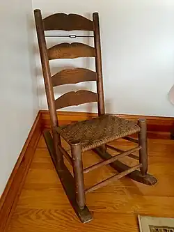 For eighty years, Wolfsville was a regional center of chair making, primary through the business operated by the Stottlemyer Family. In the decade prior to the American Civil War, Frederick Stottlemyer (1830-1913) established a shop and began turning Shaker-styled ladderback straight and rocking chairs. Frederick's son, Christopher Columbus Stottlemyer (1857-1931) apprenticed with his father and gradually assumed the management of the family's business, modernizing the production through the introduction of a steam powered lathe and sawmill, increasing the shop's output in the last quarter of the nineteenth century.[8] Christopher Stottlemyer also developed many of the characteristic components for which Stottlemyer Chairs came to be recognized, including scalloped back slats and turned acorn-shaped finials on the back posts of the chairs. Stottlemyer chairs were mostly produced in three forms: straight chairs, sewing or nursing rockers (a rocking chair without arms), and armed rocking chairs. The shop also produced other furniture, including tables and cradles.[9]
