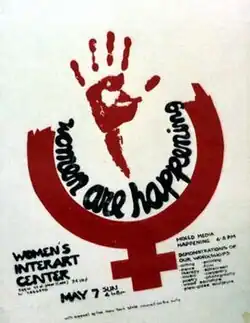 The idea for the Women's Interart Center emerged in 1969 from the meetings of a group of women from various creative disciplines who gathered regularly in Lower Manhattan artist's lofts and other repurposed spaces to present their work to each other.[1][2] In the summer of 1970, an overlapping group of artists affiliated with Women Artists in Revolution (WAR) and Feminists in the Arts requested a grant of $55,000 from the New York State Council on the Arts (NYSCA) to acquire a five-story building with space for administrative offices, galleries, and photography and graphics workshops.[3] After the group's proposal was turned down, artists including Muriel Castanis, Nancy Edelstein, Jan McDevitt, and Jacqueline Skiles staged a protest on October 27, 1970.[4] They ultimately received a grant of $5,000.[3]
