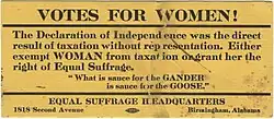 Women's suffrage efforts picked up in Alabama in the 1910s.[13] Mary Partridge wrote to Anna Howard Shaw for advice and received encouragement to start a suffrage group in Selma.[14][15] On March 29, 1910, Partridge and others created the Selma Suffrage League.[13][14][16] In 1911, several women were inspired by the speeches given by Jane Addams and Louisiana suffragist, Jean Gordon, at the National Child Labor conference in Birmingham.[13][15] Following the conference, Pattie Ruffner Jacobs and other women created the Birmingham Equal Suffrage League on October 22, 1911.[13][14] These two groups had the strongest voices in the suffrage movement at the time.[17] In 1912, Alabama suffragists decided to form a statewide group.[18] On October 9, the Alabama Equal Suffrage Association (AESA) was created.[19] AESA affiliated with the National American Woman Suffrage Association (NAWSA).[20] Jacobs served as the first president and Partridge was elected vice-president.[19] Headquarters were secured in Birmingham and the group began to advocate for women's suffrage and create resources.[21] AESA had a traveling library of suffrage materials and the headquarters served as a place in the city for women to meet.[21][22] The Huntsville Equal Suffrage Association was created in 1912 after Jacobs put out the call for more local organizing.[7]
