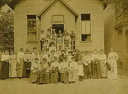 The first women's suffrage convention in the state was held on June 16 and 17 in 1870 at Mount Pleasant.[24] At the convention, organized by Joseph Dugdale, the Iowa Woman Suffrage Association (IWSA) was created with Henry O'Connor as president and Bloomer as vice president.[24][25] Four months later, a local suffrage group was formed by prominent women in Des Moines.[26] The women involved included Mary Darwin, Mattie Griffith, Nettie Sanford, and Annie Nowlin Savery.[27] During this time, the news attempted to cast the IWSA as a proponent of "free-love" and against marriage in order to discredit the movement.[28] On October 25, 1870, suffragists in Polk County also organized their own group.[29]