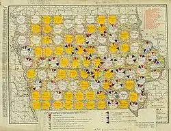 In 1912, the Progressive, Prohibition, Republican, and Socialist parties in Iowa officially endorsed women's suffrage.[57] The next year, both the state House and Senate passed a women's suffrage resolution, which would have to pass again in the next session in 1915.[58] During the next legislative session, the resolution passed the Senate 38 to 11 and the House by 84 to 19.[58] The referendum for the amendment would be voted on in the next primary election on June 5, 1916.[58]