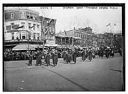 Missouri was represented in the Woman Suffrage Procession on March 3, 1913. The Maryville Ladies Marching Band, from Maryville, Missouri, was the only all-women band in the parade.[34] When the parade became violent with men pushing and harassing the women, the band was used to calm the crowd.[35] It was reported that the men were "shocked at the sight of women playing such 'wonderful music.'"[36] That spring, in the state of Missouri, MESA collected more than 14,000 signatures in support of women's suffrage.[36] Representative Thomas J. Roney brought the petition to the Missouri General Assembly and helped create a women's suffrage bill.[36] The bill was defeated in the Senate, and its defeat was discouraging for many women in Missouri.[37]