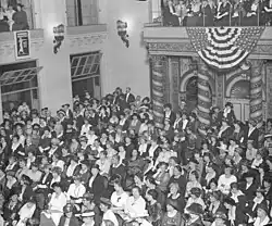 The day before the special session convened, suffrage groups, along with members of the Women's Christian Temperance Union (WCTU) hosted a suffrage luncheon and dinner.[71] The dinner was also accompanied by speeches and had a general sense of celebration.[72] On July 2, women lined the streets from the New Central Hotel to the Missouri Capitol, holding yellow umbrellas and wearing sashes and yellow flowers.[73] That day the amendment passed the Missouri house by 125 to 4 and in the Senate by 29 to 3.[73] During the proceedings the galleries were filled with suffragists.[73] The next day, Governor Gardner signed the ratification bill.[73]