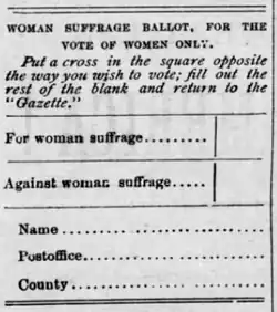 On November 30, 1894, the Lucy Stone Non-Partisan Equal Suffrage League was formed in Austin, Nevada with Fannie Weller as president.[11][12] Frances Slaven Williamson was also involved with creating the non-partisan suffrage group.[13] Williamson started to get her writing about women's suffrage published in newspapers around the state.[13] The group helped lobby for another suffrage resolution in the Nevada Legislature which passed in 1895.[13] The Lucy Stone group dissolved by late April 1895.[13]