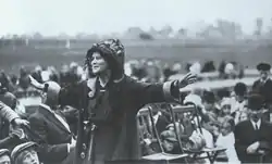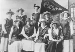 Suffragists also showed the film, Votes for Women, featuring Jane Addams, throughout the state.[55] Using cars in the Wisconsin suffrage campaigns was also extremely popular.[54] The first auto tour started in Milwaukee on August 2, 1911 and visited eight counties to the south.[54] Car tours helped build publicity and gave local suffrage groups something to campaign around.[54] Women in the tours used the cars themselves as a speaking platform and often wore matching yellow tunics.[54][61] A "Votes for Women" boat tour on the Wolf River also took place.[62] Buffalo Bill Cody also helped the cause when he visited Green Bay, with a suffrage banner carried by his Wild West circus.[63] The suffragists visited county fairs and set up suffrage booths to get out their message and answer questions.[54] The Wisconsin State Fair in 1911 had a Woman's Day which included special programs and exhibits relating to women's suffrage.[54] During the State Fair Dan Patch, a famous pacing horse, carried a "Votes for Women" banner.[63] Al Ringling was hired by Georgina J. Koppke in Baraboo to create a multimedia women's suffrage production.[63]