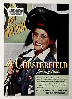 In 1965, it was reported that 33.9% of women were smoking.[20] Virginia Slims came on the market in 1968, and used the catch phrase "You’ve come a long way baby." This was the first cigarette to be marketed solely as a woman's cigarette. The cigarettes were longer, slimmer, and overall more elegant and feminine. The ads depicted photos of glamorous women set against photos of women doing mundane tasks such as laundry or housework.[21] 1970 saw the release of Liggett & Myers Tobacco Company's entry into women specific cigarettes, Eve. Eve cigarettes were decidedly more feminine than Virginia Slims. Eve featured flowers or other feminine motifs on both the packaging and the cigarette themselves.