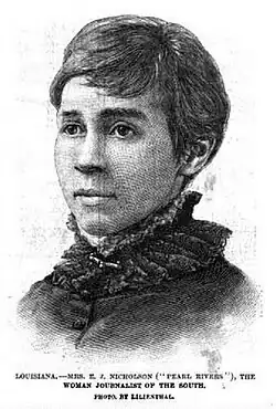 Eliza Jane Poitevent, also known as Pearl Rivers, the owner of the New Orleans Picayune, along with other women such as Elia Good Byington, Mary Ann Thomas, Florence Williams, Addie McGrath, published papers primarily devoted to women's rights and were all very influential among the general public, despite the fact it was a time and place when societal norms were rigidly enforced.[13][1][14][15][16] The New Orleans Picayune published a series of opinions on the great number of women needing work and the conditions that Southern Women must face in the work place.[1] Labor reform was often a topic of discussion among editorials. In 1866, a book entitled The Last Ninety Days of the War in North Carolina, by Cornelia Phillips Spencer, was published offering opinions of work allotted to women and their place in society.[17] Her publication gained great popularity and her opinion began being sought by public officials throughout the state of North Carolina and by administrators at the University of North Carolina.[1] Though it held little political influence, Louisa May Alcott's Little Women was published 1868 and had an influence among women challenging women's socialization into home life.[18] In 1882, Elizabeth Stuart Phelps published a novel entitled, Doctor Zay and was a novel about women doctors of that period, with the intent to portray women as being able to "have it all", having both a successful career and marriage.[4] Between 1870 and 1890 thirty-three suffrage periodicals existed. The Women's Journal, published in 1870 by Lucy Stone, was yet another way to achieve women advocacy and was a pathway for women to gain further support for suffrage movements. This periodical was said to have been the most influential of all the suffrage publishings as it had over thirty thousand readers by 1883.[4]