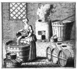 Traditional Germanic societies were reported by the Romans to drink ale, made predominantly of fermented honey, produced by women.[32] Until monasteries took over the production of alcoholic beverages in the 11th century, making it a profession for monks and nuns, brewing was the domain of tribal Germanic women.[33][34] Migratory Germanic tribe women typically brewed their meads and ales in the forest, to avoid pillages by invaders. Their beverages did not contain hops, which were first recommended as an additive by St. Hildegard of Bingen. Because hops served as a preservative, beer's suitability for consumption became longer, though the addition of hops also increased the cost of brewing.[15] In the decades before the Black Death in Europe, many households required a large amount of ale, because of a lack of potable water and expense of other beverages.[35][36] Women used the opportunity of brewing to make extra money at home.[35] In Brigstock, some women obtained licenses to brew over several months.[35] Women in northern England were the main brewers for the community.[35] As elsewhere in Europe, the founding of guilds often forced women out of the brewing industry; however, in Haarlem in the Netherlands, because women were allowed to inherit guild membership from spouses, many continued in the profession. Data collected on the period between 1518 and 1663, showed that 97 brewsters, three-quarters of whom were widows, were operating among a total of 536 brewers in the city.[37]