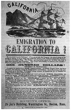 During the Gold Rush, women migrants headed to California traveled on one of the only two routes: overland on wagon trains known as the California Trail or by ship through the Cape Horn Route or Panama Shortcut. Many American women’s diaries and letters reveal that a majority of women were pressured to travel to California to stay with their husbands and families.[3] As travel arrangements improved and miners gained more wealth, many men with few options for female company in California turned homeward for companionship. Some men sent their wives or other women money for their passage to join them in California. Simultaneously, the Gold Rush experience and economic and social conditions attracted prostitutes worldwide, as well as the importation of women for the flesh trade.[2] In San Francisco, the documentation of Chinese girls as slave imports was common, as hundreds of girls would be brought to the ports to be inspected and sold at auctions to brothel owners regularly.[4]