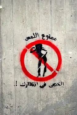 During the Arab Spring revolutions, and in the years leading up to them, graffiti was commonly used as a form of popular protest. Street art was an effective way to spread the message of political rebellion, since it is in public view. Furthermore, since authoritarian Arab leaders had poured significant resources into public beautification projects in order to demonstrate their absolute ownership of the public space, street art was a way for the people to reclaim that public space.[4] During the Arab Spring, street art became a prominent form of protest in many Arab countries, including Egypt, Tunisia, Libya, and Syria.[5] An earlier example of this reclamation of public space is graffiti painted during the Palestinian intifada during the late 1980s. While Israeli state censorship prevented the production of a lot of Palestinian protest art, Palestinians were able to paint graffiti in order to spread their message without being stopped by the state. Also, the anonymity of the art form made it a stand-in for the collective spirit of Palestinians.[6]