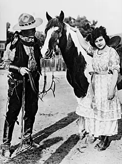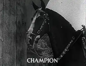 Champion, the Wonder Horse, was the onscreen companion of the singing cowboy Gene Autry. Originally belonging to Tom Mix, Autry likely purchased Champion after working with him in The Phantom Empire series.[21] Several horses bore the name Champion; the first died while Autry was serving in the Army Air Force during World War II.[22]