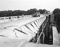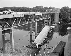 In it's early days Woodbridge was dominated by two large plantations. Thomas Mason's Woodbridge Plantation situated north of Marumsco Creek. The Woodbridge Plantation would eventually become known as "Deep Hole Plantation". The plantation of "Belle Aire", owned initially by the Linton family and then by the Grayson family, was the other prominent plantation in the area, it was situated south of Marumsco creek and served as a field hospital during the civil war. Belle Aire should not be confused with the Bel Air Plantation located five miles inland. The original bridge for which the community took it's name was washed away in 1807 following a heavy storm.[7] Subsequently, industrial and economic development shifted toward Occoquan the next nearest river crossing. The bridge would not be replaced until the 20th century when an iron truss bridge was built. This bridge failed in 1972 during Hurricane Agnes and was eventually replaced by the current structure.