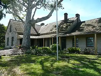 To the west of the building complex an area of poplars, suckers and undergrowth with Nile lilies (Agapanthus orientalis/praecox), weeds and other undergrowth existed.[3] To the north (rear) of the building complex a similar area of poplar suckers, undergrowth, rubbish tip, septic tank, piles of building debris, a fruit tree and black bean (Castanospermum australe) fill the "courtyard" space between wing buildings which are located at right angles to the main building. Areas of sandstone paving are also part of this "space".[1]