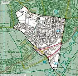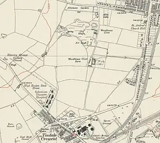 Originally the land housed Woodhouse Close Farm, and Woodhouse Close Colliery (also known as Tindale Colliery)[1] from 1835.[1] The Colliery was located just south of where "Woodhouse Lane" is today. There was also a "New" Woodhouse Close Colliery built where "Weardale Drive" is situated now and a tramway linked the two. Both collieries were owned by The "Woodhouse Close Colliery Co., Ltd".[2] The collieries both closed in March 1934 and the site remained derelict.[3] In the 1930s a plan for a new housing development called "Woodhouse Close" was proposed but was interrupted by World War II.[3]