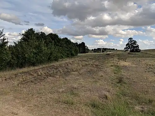 Woodhouselee railway station was a railway station on the Crookwell railway line, in Woodhouselee, New South Wales, Australia. The station opened in 1902 with the opening of the line, and consisted of a 100 ft platform on the up side of the line with a loop siding on the down side.[1] It was named after a local resident Mr Woodhouse. The platform was closed in 1974 with the cessation of passenger services and subsequently demolished.[2] The line through Woodhouselee closed to goods traffic in 1984, the loop has been removed but the mainline remains intact.