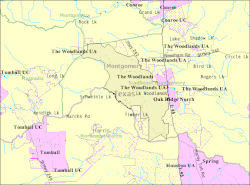 - ^ "2020 CENSUS - SCHOOL DISTRICT REFERENCE MAP: Montgomery County, TX" (PDF). U.S. Census Bureau. Retrieved April 27, 2022. - Compare to The Woodlands boundary map