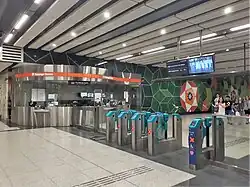 Commissioned as part of the Art-in-Transit programme, Kng Mian Tze's 3652 + 50 is displayed at this station. Consisting of geometric shapes arranged in a Penrose design,[25] the symbols and messages in the artwork were written by 50 individuals as part of the artist's engagement with the local community.[26] These messages and symbols were promises set by the volunteers in 2013 to work on for the subsequent 10 years. It was expected that by the time the station opened, the participants have moved on to a different stage of life.[23]