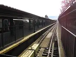 The station has two tracks, one center island platform and two disused side platforms extending south, ending a short distance north of 213th Street. The tracks end at bumper blocks at the north end of the platforms. The station was formerly set up as a Spanish solution with alighting passengers using the side platforms and boarding passengers using the island platform in a style similar to the other Bronx IRT terminals. Now all passengers use the island platform.[26] The 4 stops here at all times.[27]