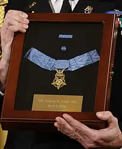 On March 3, 2008, following a long campaign by his family and the congressional delegations of both North and South Dakota, President George W. Bush posthumously awarded Keeble the Medal of Honor for his heroic actions on October 20, 1951, in the Korean War. Keeble had previously been awarded the Distinguished Service Cross for these actions in 1952. He was wounded at least twice in World War II and three times in Korea, but he had received only two Purple Hearts for these injuries;[1] later he was credited with four Purple Hearts.[2]