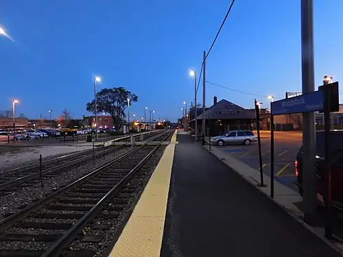 Woodstock is a commuter railroad station on Metra's Union Pacific Northwest Line located in Woodstock, Illinois. The station is located on the Harvard branch of the Northwest Line and is the last stop before Harvard; inbound trains run as far as Ogilvie Transportation Center in Chicago. The station is located in fare zone 4. Woodstock is 51.6 miles (83.0 km) from Chicago via Metra.[2] The station consists of two grade-level side platforms which serve two tracks; there is a rail crossover located just north of the station. As of 2018, Woodstock is the 149th busiest of the 236 non-downtown stations on the Metra system, with an average of 273 weekday boardings.[1]