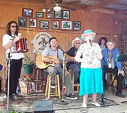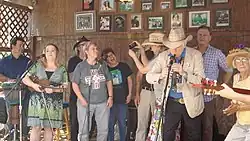 The 10th annual festival took place July 11–15, 2007. To celebrate the ten-year anniversary, one of many Oklahoma centennial-year events, the festival kicked off with a ticketed event on Wednesday night in Okemah's historic Crystal Theater.[2] Seven "10-year artists" – artists who have participated every year since the festival's inception – performed at a Coalition benefit show titled "In the Spirit of Woody Guthrie". Those artists were Jimmy LaFave, Don Conoscenti, Ellis Paul, Bob Childers, Joel Rafael, Terry "Buffalo" Ware, and the Red Dirt Rangers.[36] The 2007 lineup spanning over four days included more than 60 artists from many genres including folk, alt-country and rock. Members of the Guthrie family scheduled to appear were Arlo Guthrie and Cathy Guthrie (daughter of Arlo) and Amy Nelson (daughter of Willie Nelson), who perform as Folk Uke. More than 100 artists performed at the festival's 10-year celebration including Kevin Welch, Sara Hickman, Butch Hancock, Tim O'Brien, Ronny Elliot, Terri Hendrix and Lloyd Maines, Rob McNurlin, Jack Williams, Antje Duvekot, Johnsmith, Sam Baker, David and Adam Amram, The Burns Sisters, Ronny Cox, Michael Fracasso, Radoslav Lorković and Eliza Gilkyson.[37] The tenth festival again concluded on Sunday with a "Hoot for Huntington's", having become a Woody Fest tradition. The hootenanny is coordinated and led by Terry "Buffalo" Ware, a guitarist living in Norman, Oklahoma, and the Woody Guthrie Folk Festival All-Star House Band. The House Band also includes Randy Crouch (fiddle/pedal steel), Don Morris (bass), Dean Brown (drums), Dan Duggin (accordion) and T.Z. Wright (keyboard/accordion). The House Band can be heard playing back-up for many festival performers and in 2007 also played a set of their own – as The Oklahoma Geniuses – at the Brick Street Cafe.[38]