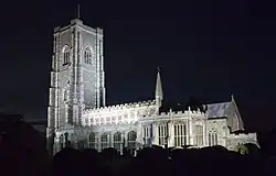 The Holy Trinity Church, Long Melford, Suffolk, is widely regarded as one of the finest wool churches in East Anglia. Built largely from 1467–1497 with funding from local cloth merchants,[2] primarily John Clopton, the structure contains magnificent stained glass from the fifteenth century, the Clopton family chantry chapel and the soaring Lady Chapel, which extends at Holy Trinity's east end.[3] The Flushwork employed by the builders of Holy Trinity is some of the finest in England. The church stands as testimony to the wool business and its overwhelming success in medieval times.[4]