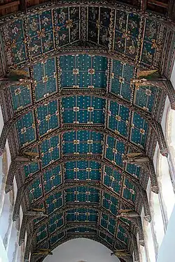 St. Agnes' Church at Cawston, Norfolk is also well known as a "wool church." Its fifteenth century nave and western tower were financed by Michael de la Pole, Earl of Suffolk, who had grown rich from the wool business.[7] As is typical of a 'wool church,' St. Agnes's scale is far grander than was required by a modest medieval village. And the Earl of Suffolk spared no expense in embellishing the interior: the de la Pole crest is carved above the entrance; French stone was used for the tower and nave; the roof, although the typical wooden East Anglian style, is an elaborate hammerbeam confection with elaborate angels curving off the beam ends, and a trio of angels on outstretched wings hovering over each clerestory window.[8]
