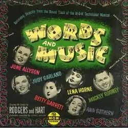 The original soundtrack to the 1948 film Words and Music was released by MGM Records earlier in the same year in three formats: as a set of four 10-inch 78-rpm records, as a set of four 7-inch 45-rpm EPs and as a 10-inch long-play. The album contained songs performed by Mickey Rooney, June Allyson, Lena Horne, Judy Garland, Betty Garrett, and Ann Sothern.[2]
