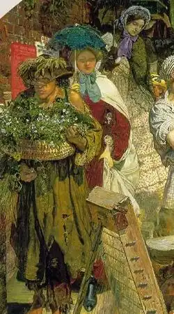 The ragged character on the left in front of the fashionable lady represents the opposite end of the social scale: an itinerant chickweed seller who lives in a flophouse in Flower and Dean Street, Whitechapel, the most notoriously criminalised part of London at the time. He is an urban worker who obtained flowers, reeds and small animals from the countryside to sell in the centre of the city. Such workers had been chronicled in Henry Mayhew's book London Labour and the London Poor. Brown's catalogue describes the character in Work as a man of "effeminate gentleness" but afflicted with paranoia.[7] The man's head is covered with straw, the wearing of which is frequently a symbol of madness in art.[7]