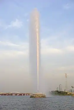 The World Cup Fountain (Korean: 월드컵 분수대) was a fountain built to commemorate the 2002 FIFA World Cup co-hosted by South Korea and Japan. The World Cup Fountain is located in the Han River in Seoul, South Korea, between the World Cup Stadium and Seonyudo Park. The fountain jets water at a height of 202 metres (663 ft), a symbolic gesture to the year the FIFA World Cup was held in Seoul. The fountain is taller than the Gateway Geyser, or the fountain in Fountain Hills, Arizona or the Port Fountain in Karachi, Pakistan. For comparison, the Washington Monument in Washington D.C. is 169 meters tall.[1]