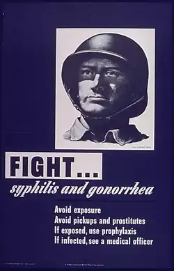 In World War II, venereal disease was a serious problem for the US Army and Navy. In some hospitals one out of eight men had contracted some form of venereal disease. Two of the worst venereal diseases known to the Medical Department during the Second World War were gonorrhea and syphilis. Consequently the majority of treatment and awareness programs had great emphasis on these two infections in particular.[1]