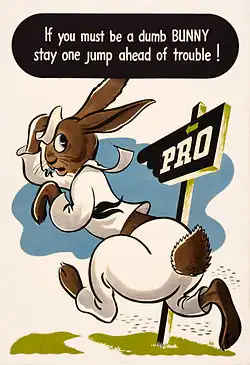 The U.S. Government produced a number of pamphlets which were issued to troops educating them about the importance of good sexual health. One of these pamphlets was "Sex Hygiene and Venereal Disease", printed August 1, 1940 by the U.S. Government Printing Office. There were also 1942 and 1943 editions. The pamphlet was to be furnished to each recruit upon enlistment. The booklet not only offered information to soldiers about avoiding V.D., but also what to do if they became infected. The pamphlet provided sufficient information about various diseases to allow troops to diagnose diseases and infections without visiting the Pro-Station.[2] The following is the summary which is offered by the pamphlet: